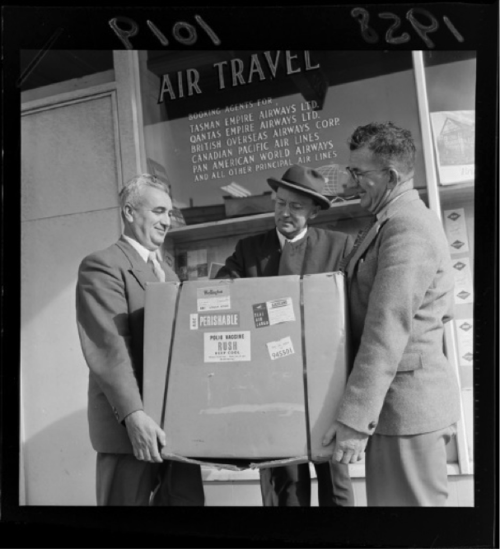 Jonas Salk’s vaccine injection was licensed in 1955 and, in a magnanimous gesture, never patented by its developer. The arrival in New Zealand of the first vaccine in 1958 was a major event, with people queueing at the airport, hoping to get a vial. This was followed in 1961 by the cheaper and more easily administered oral vaccine developed by Albert Sabin. A mass immunisation campaign in New Zealand, using the Sabin oral vaccine, achieved high population coverage and eliminated the polio virus from this country.