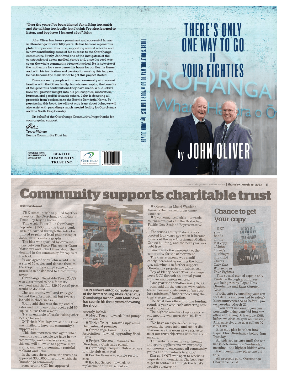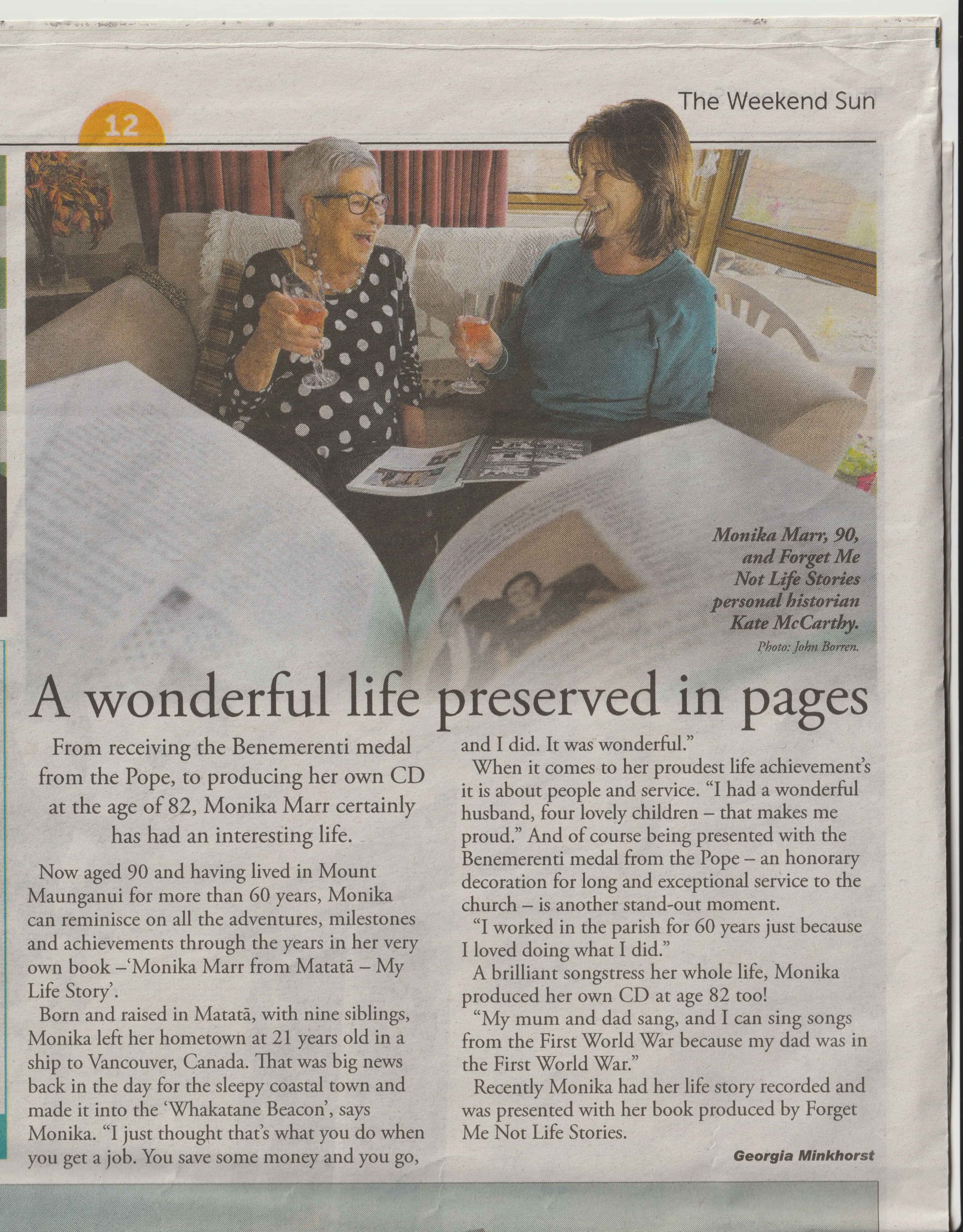 Samantha was a breath of fresh air, made what I thought was a huge job into an enjoyable year of putting my memories into book form. The project gave me tremendous personal satisfaction and brought back memories of my youth, friends, trips, family days and how I kept food on the table. Money received from the sale of my book locally in Otorohanga was donated towards the building of a new dementia centre called The Homestead at the Beattie Home, and to the Otorohanga Charitable Trust. Readers who I did not know got in touch because my book connected with their earlier lives and memories in the King Country. The last available signed copy was auctioned and proceeds donated to the Otorohanga Charitable Trust.Newspaper article Credit: King Country News