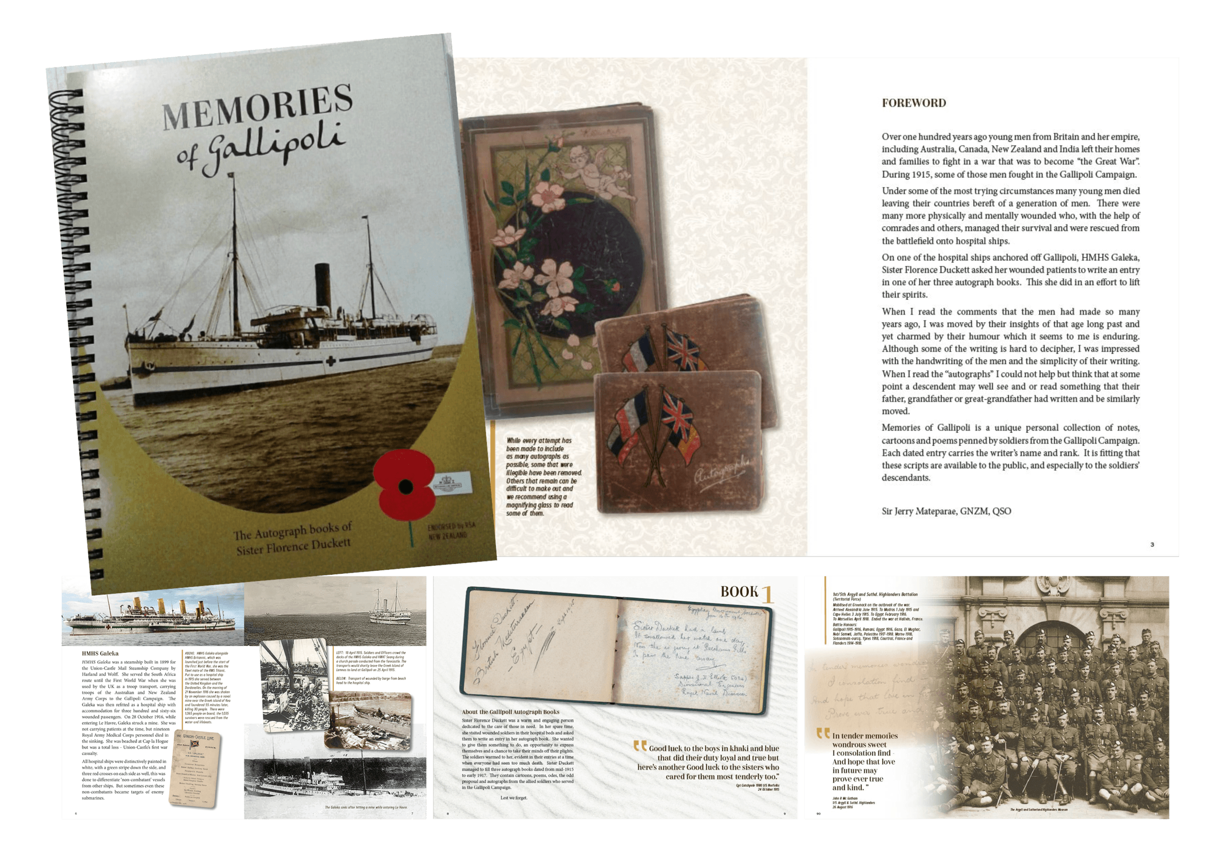 Memories of Gallipoli was compiled from autograph books which belonged to Sister Florence Duckett, a nursing sister on the hospital ship HMHS Galeka in WW1. Memories of Gallipoli is a unique personal collection of autographs, notes, cartoons and poems penned by soldiers from the Gallipoli campaign. Endorsed by the RSA of NZ and with a Foreword by Sir Jerry Mateparae, the book provides a rare glimpse into a war fought long ago.